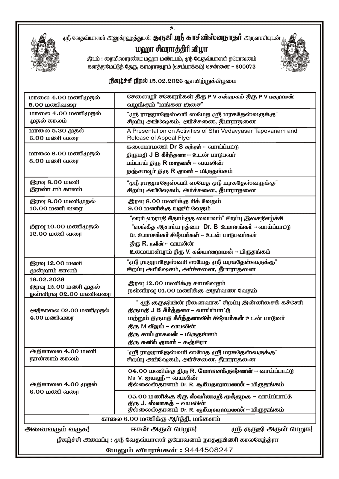 Shri Vedavyasar Tapovanam (SVVT) is a spiritual and cultural center started in 1994. It protects Vedic traditions, teaches good values, and works for peace and wellbeing in society. The Tapovanam has a rare Mandapam for Sage Vedavyasar, built in 2003 at Kamarajapuram (Sembakkam) Chennai 600073.
